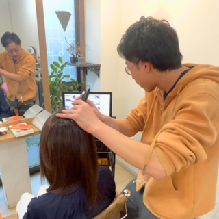 毛母細胞が活性化することも証明済みのオリジナル商品で徹底的にケアをしながらカラーリングをしていくんです。