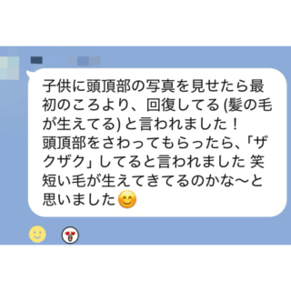 子供に頭頂部の写真を見せたら最初のころより、回復してる(髪の毛が生えてる)と言われました! 頭頂部を触ってもらったら「ザクザク」してると言われました。笑 短い毛が生えてきてるのかな〜と思いました。 Sさまは、育毛剤・サプリ・薄毛改善に良いと...