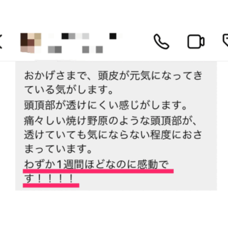 おかげさまで頭皮が元気になっている気がします。 頭頂部が透けにくい感じがします。 痛々しい焼け野原のような頭頂部が、透けていても気にならない程度におさまっています。 わずか1週間ほ...